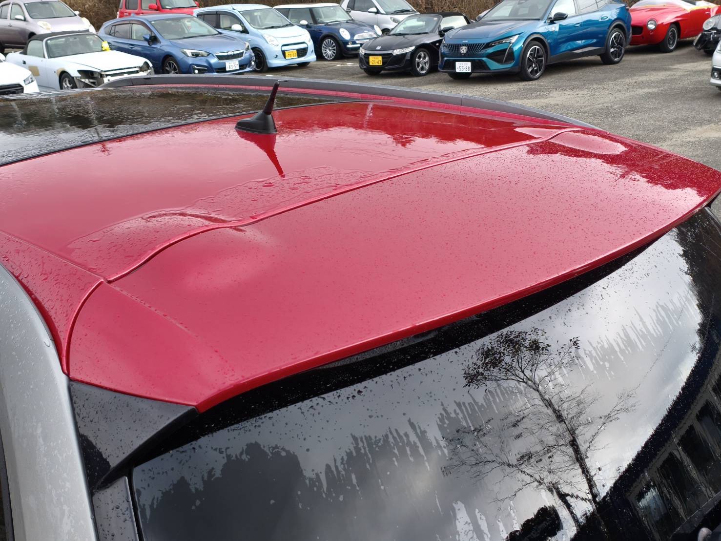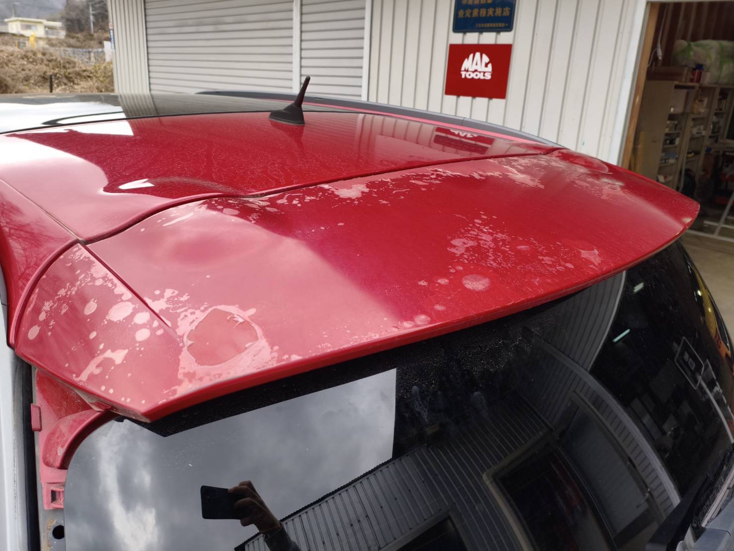 リアウィングのクリア剥げの補修塗装でお預かりさせていただきました。 写真に修理前の状態を載せていますのでご確認いただけると思いますが、とても激しいクリア劣化でした。 エアブローで剥がれていくレベルです。 そのため、まずは色剥離を行い、サフェーサーを塗布し、隣接しているルーフとの調色も丁寧に行い、綺麗に仕上がりました。