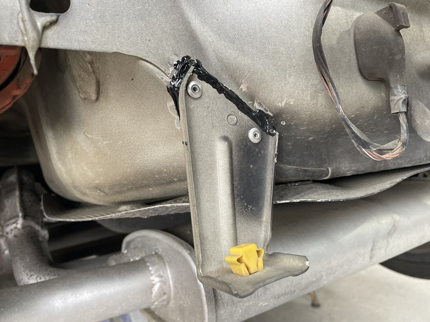 リアバンパー下の取付部分がボディから折れて外れていたために走行中の干渉音が気になるという事でご入庫いただきました。 フレームステイをリベット止めして固定しましたので、干渉音も無くご満足していただけました。